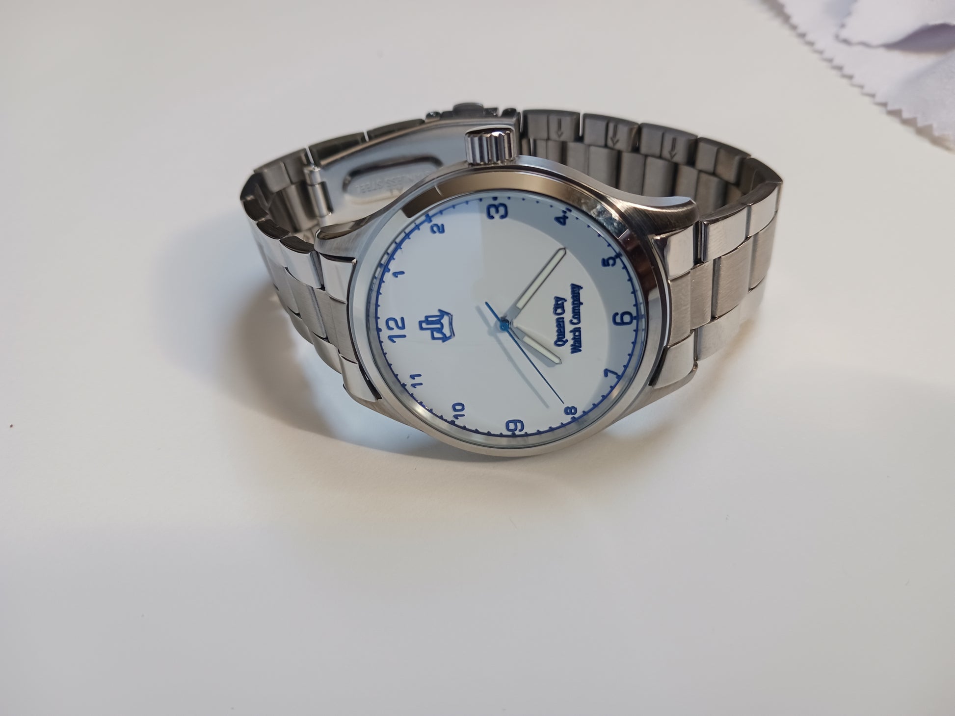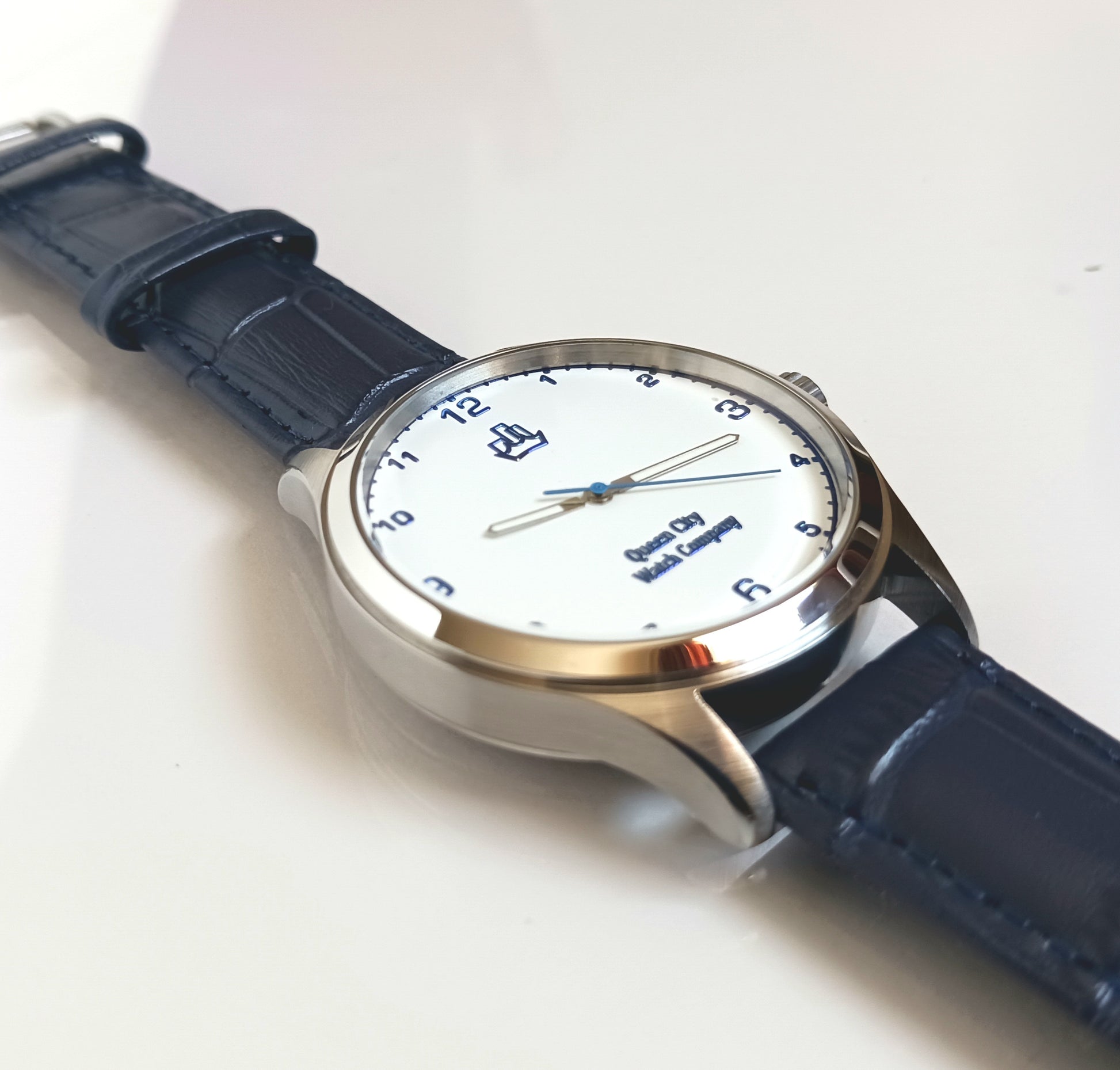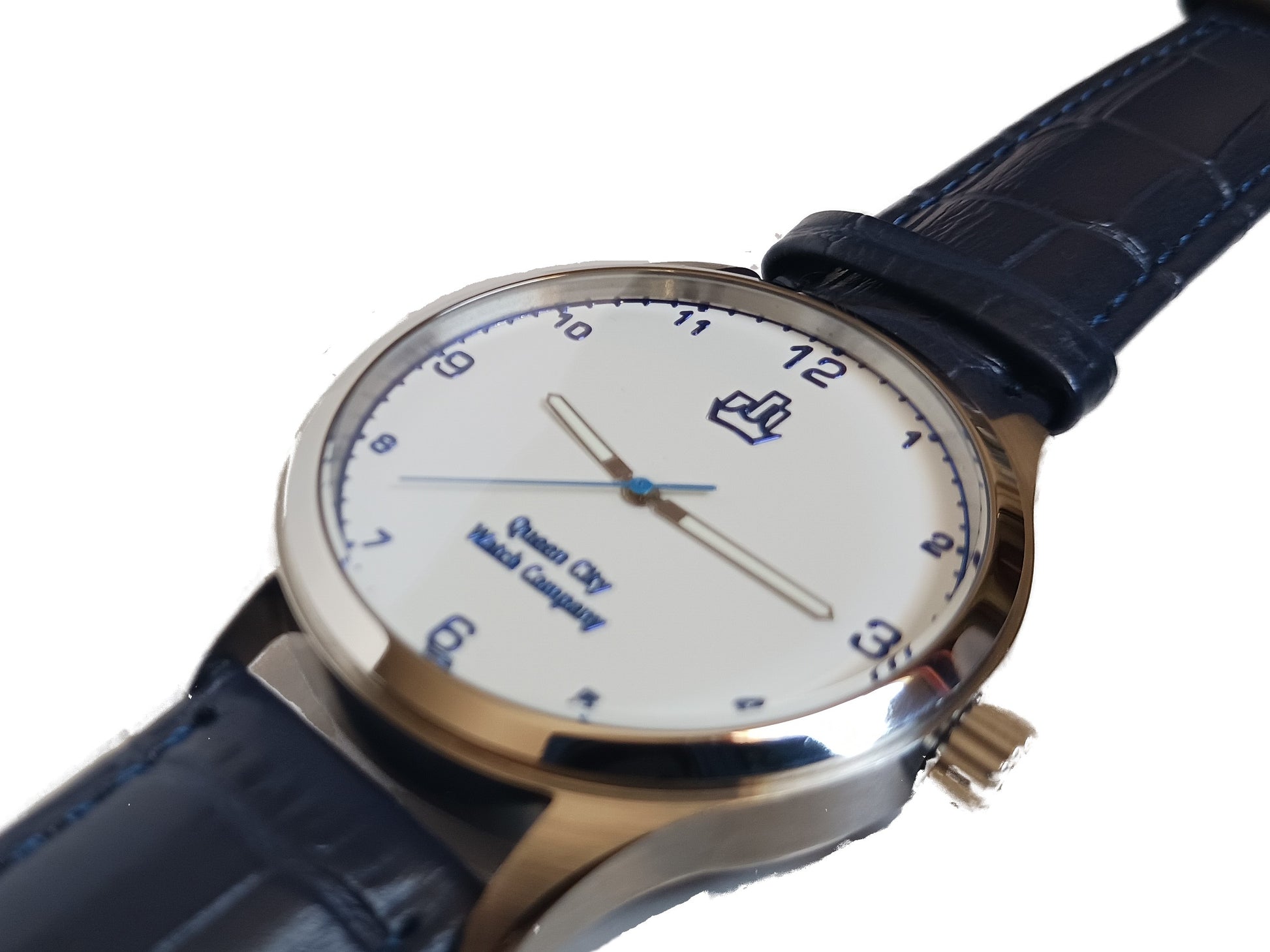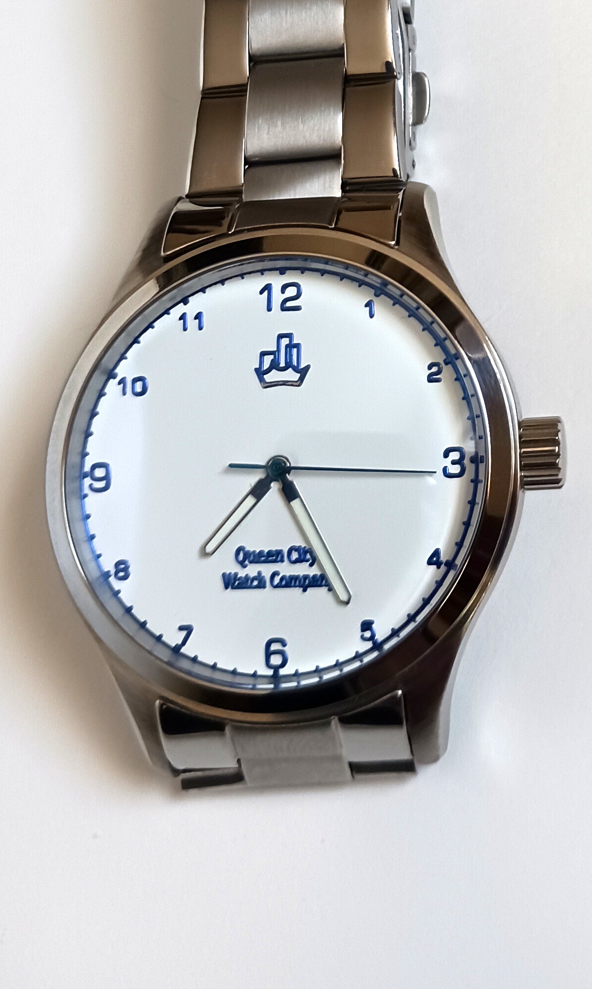 A comfortable, mid-sized watch with a timeless style that's designed for everyday wear. Versatile enough to pair well with casual blue jeans or a high-end tailored suit. White dial with blue leather or steel band. Made with a 40mm steel case, a scratch-resistant sapphire crystal, a Ronda quartz movement, a screw down crown, and lumed hands for added visibility.