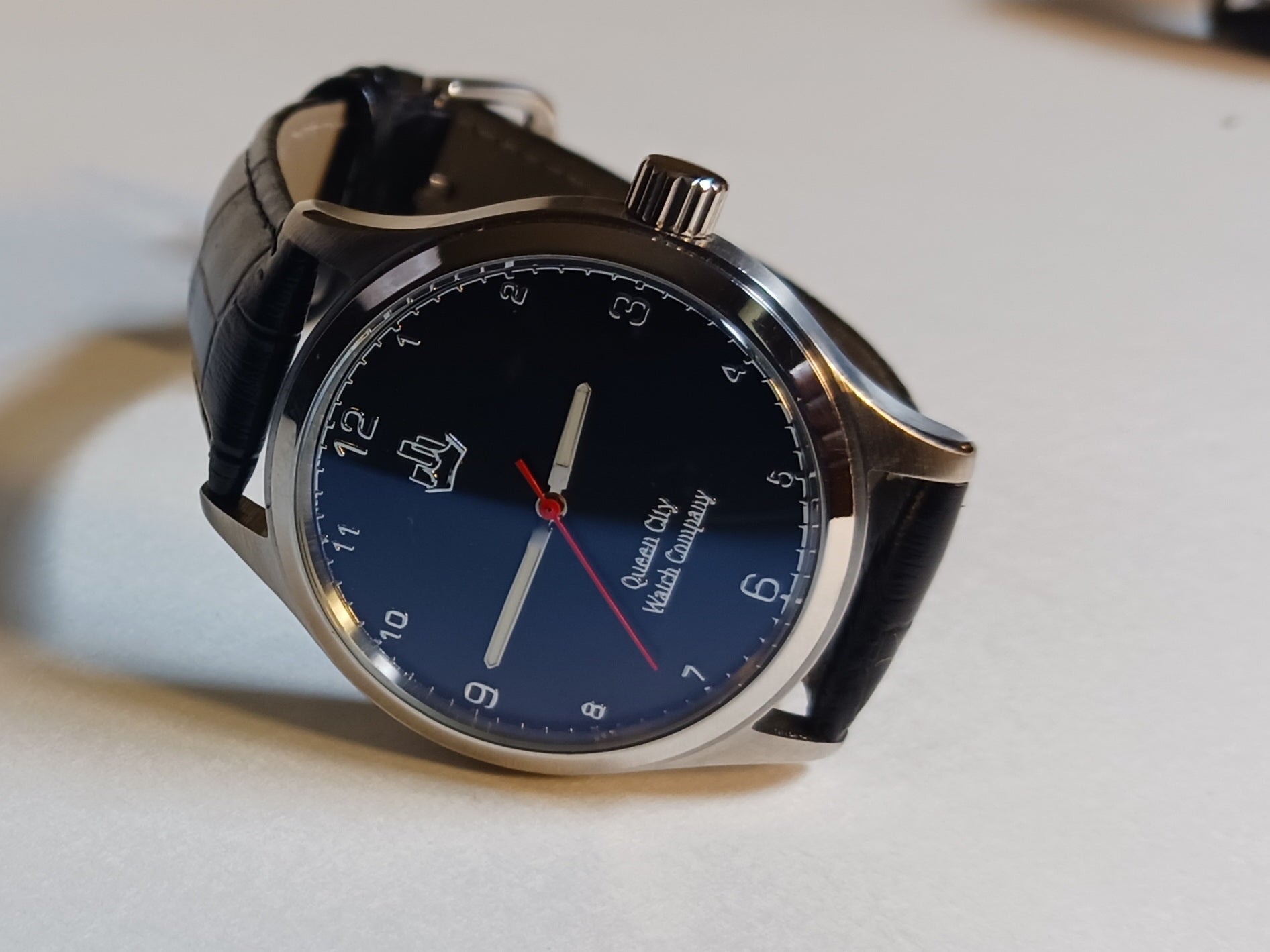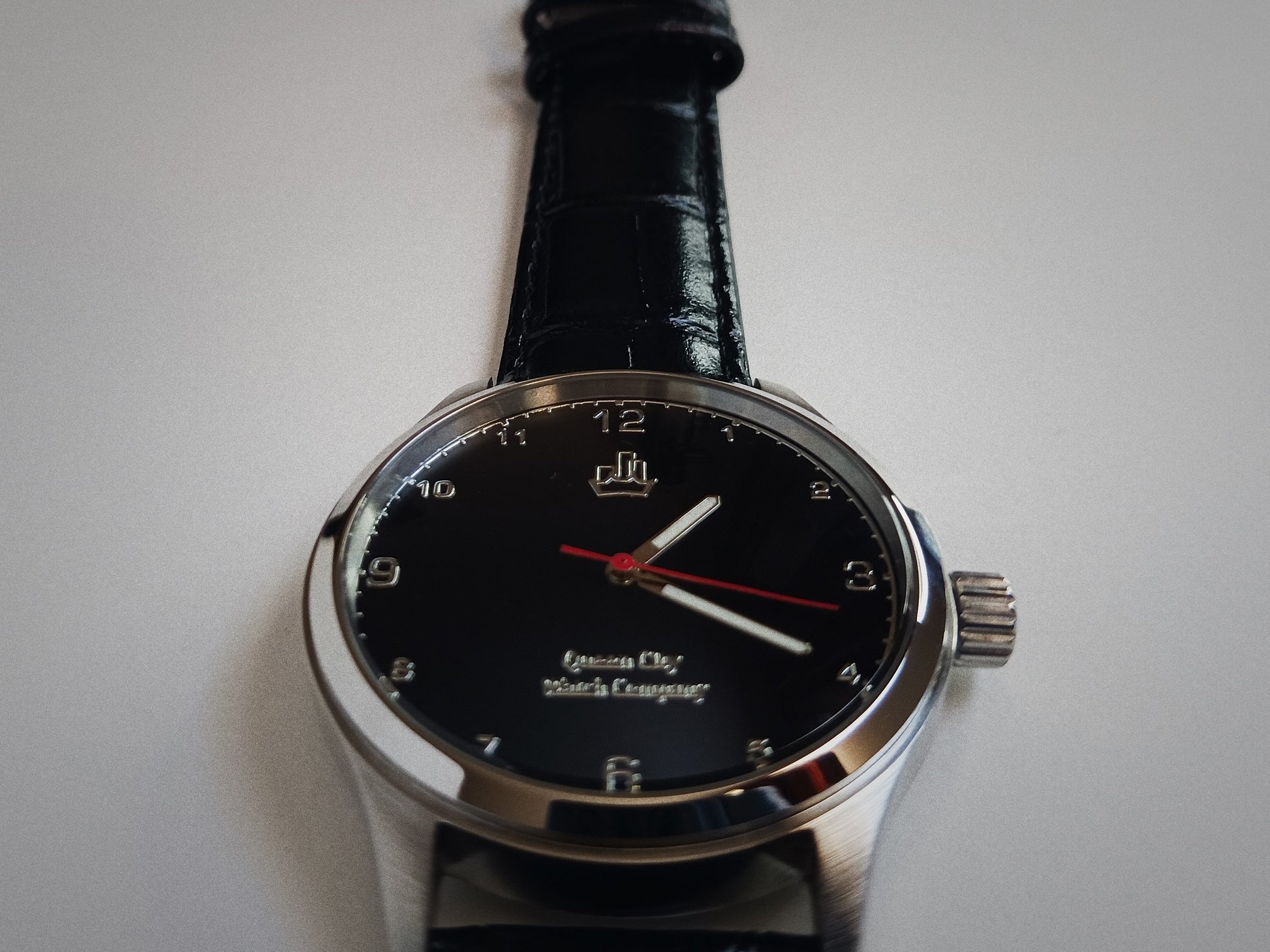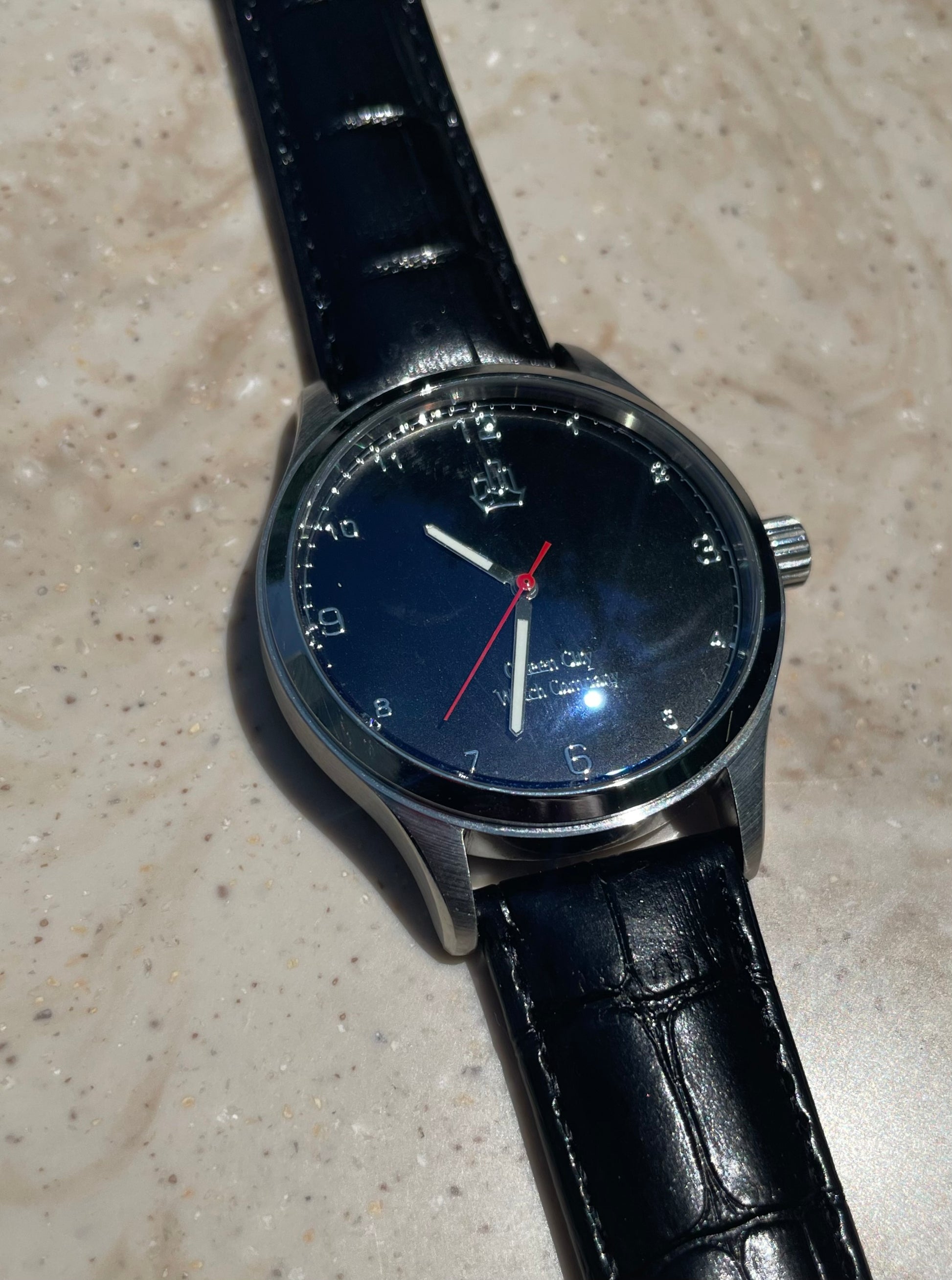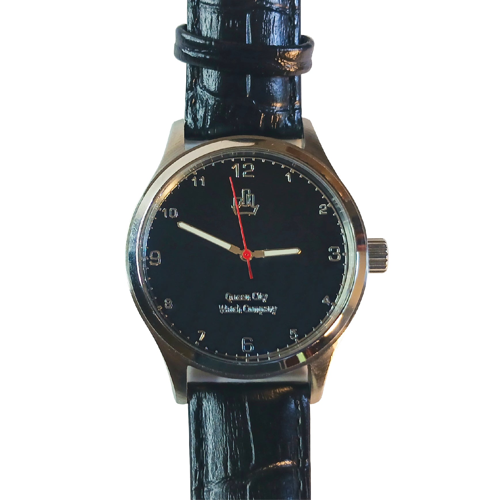 A comfortable, mid-sized watch with a classic style. Designed for everyday wear but versatile enough to pair with a dressy outfit. Black dial with black leather or steel band. Made with a 40mm steel case, a scratch-resistant sapphire crystal, a Ronda quartz movement, a screw down crown, and lumed hands for added visibility.