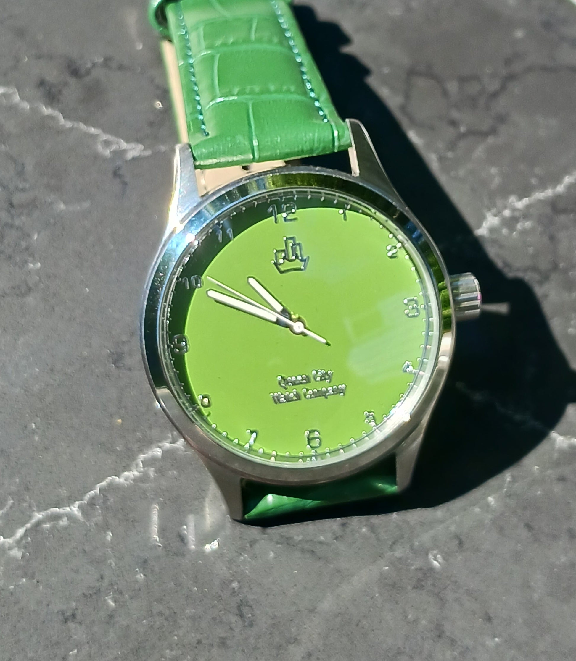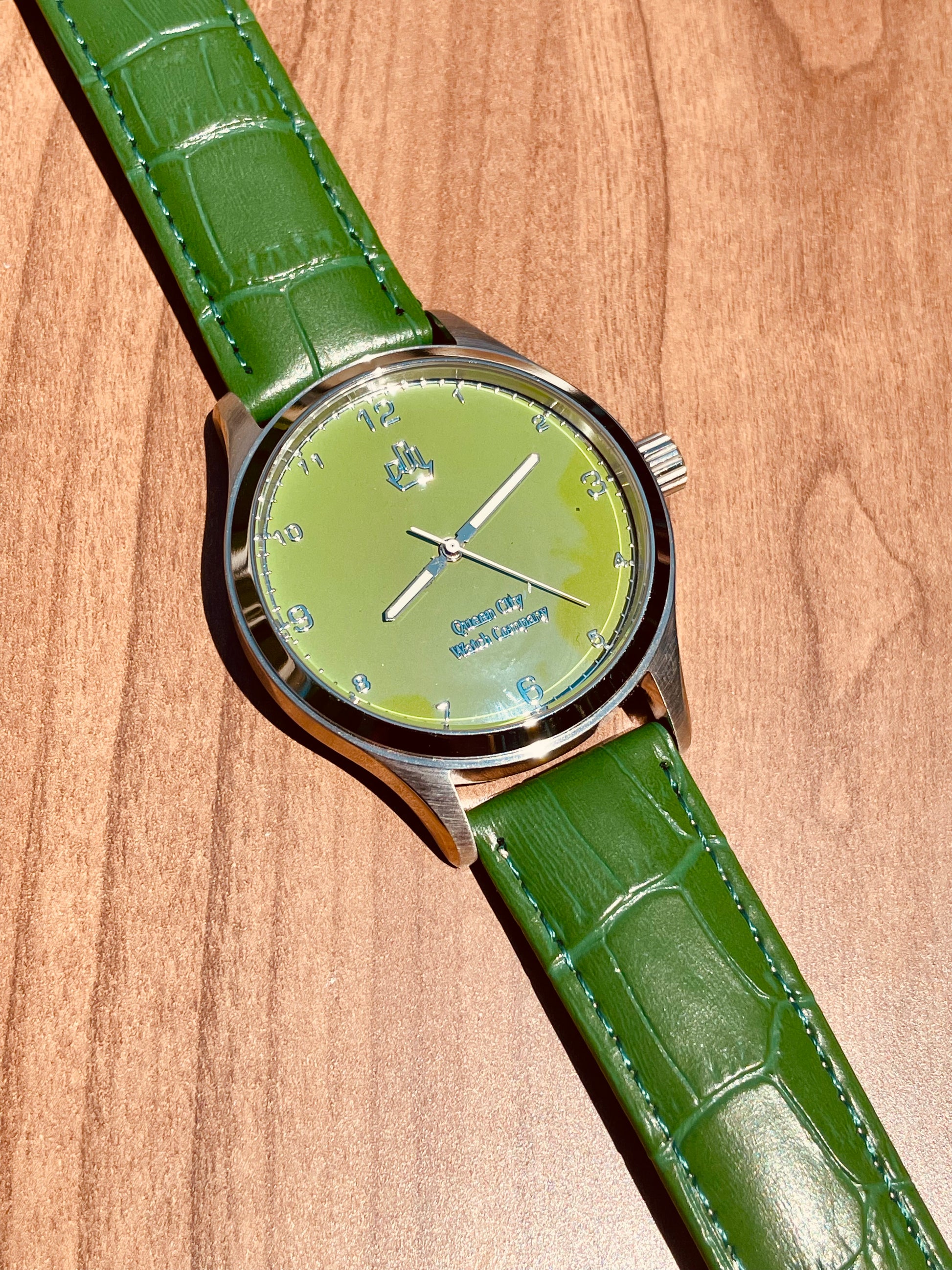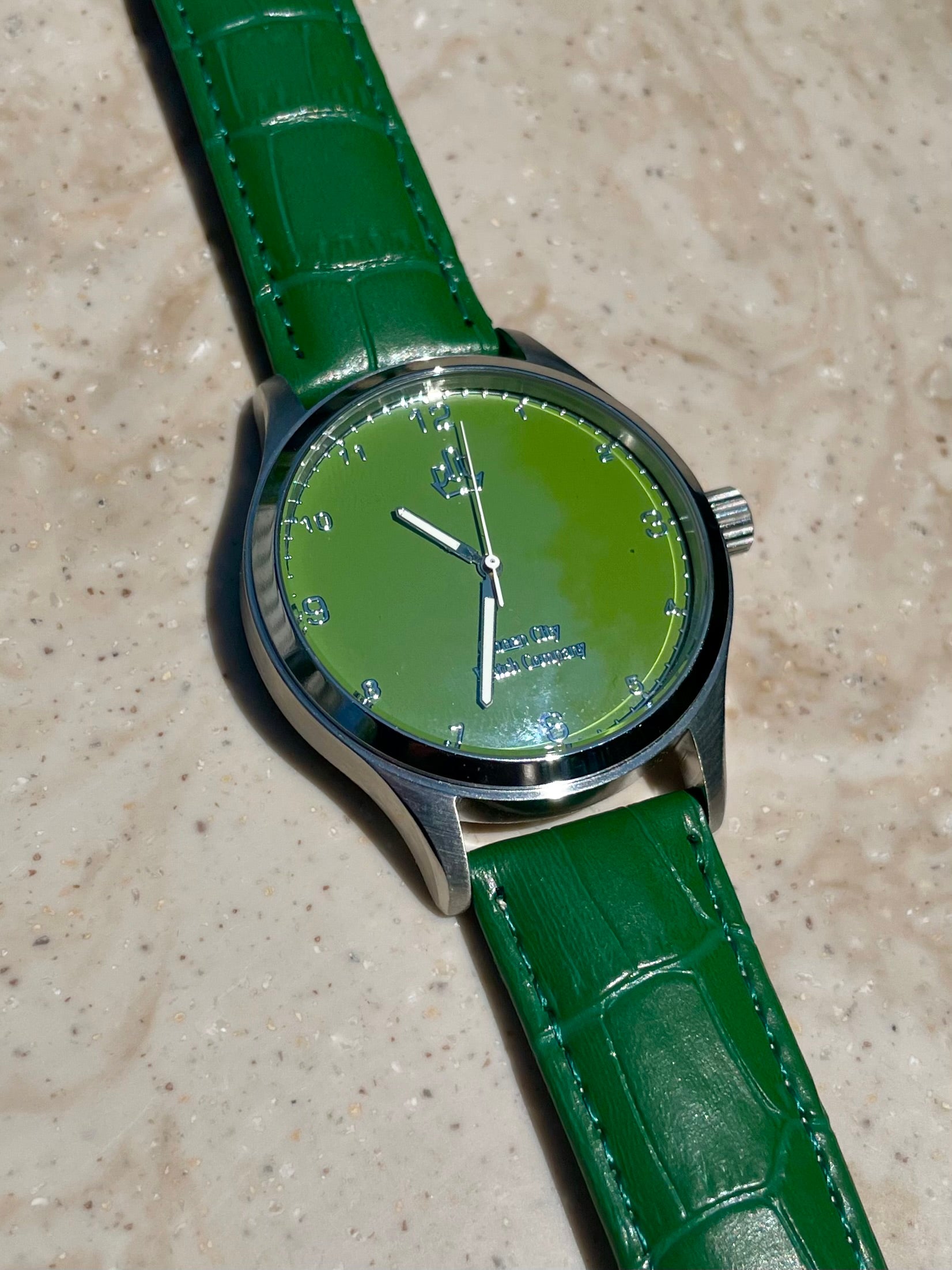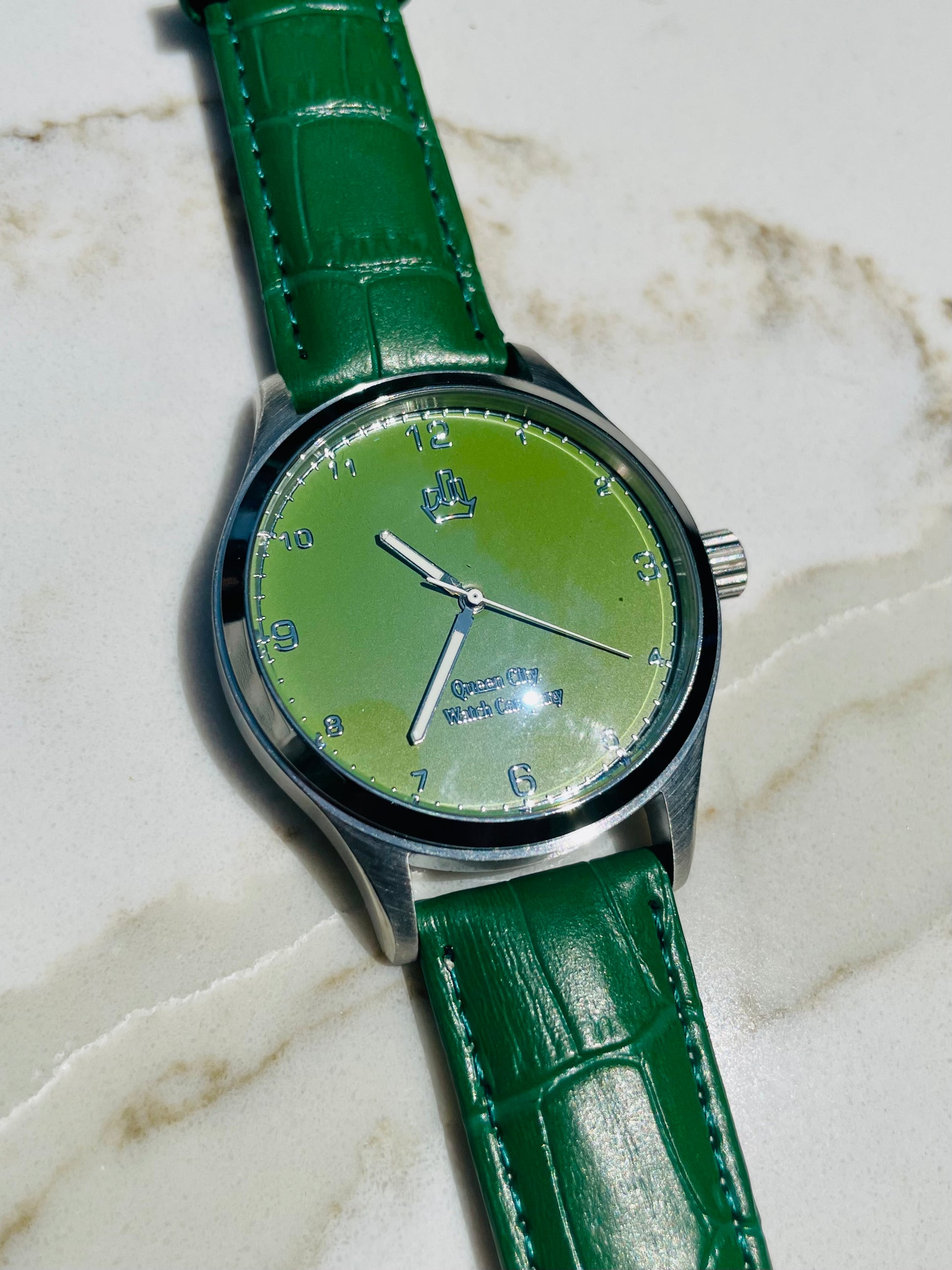 A comfortable mid-sized watch with classic style. Designed for everyday wear but versatile enough to pair with a dressy outfit. Green dial with green leather or steel band. Made with a 40mm steel case, a scratch-resistant sapphire crystal, a Ronda quartz movement, a screw down crown, and lumed hands for added visibility.