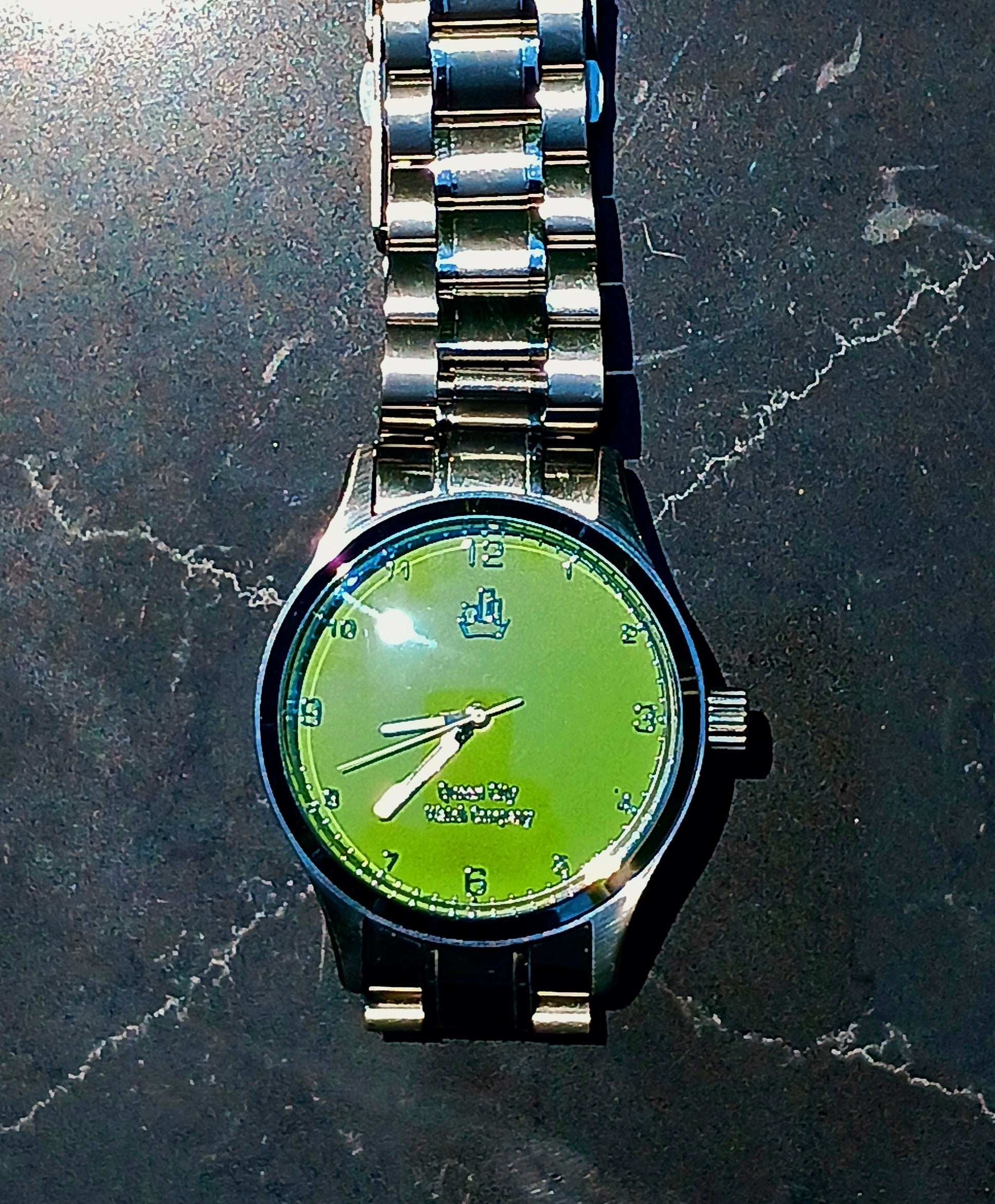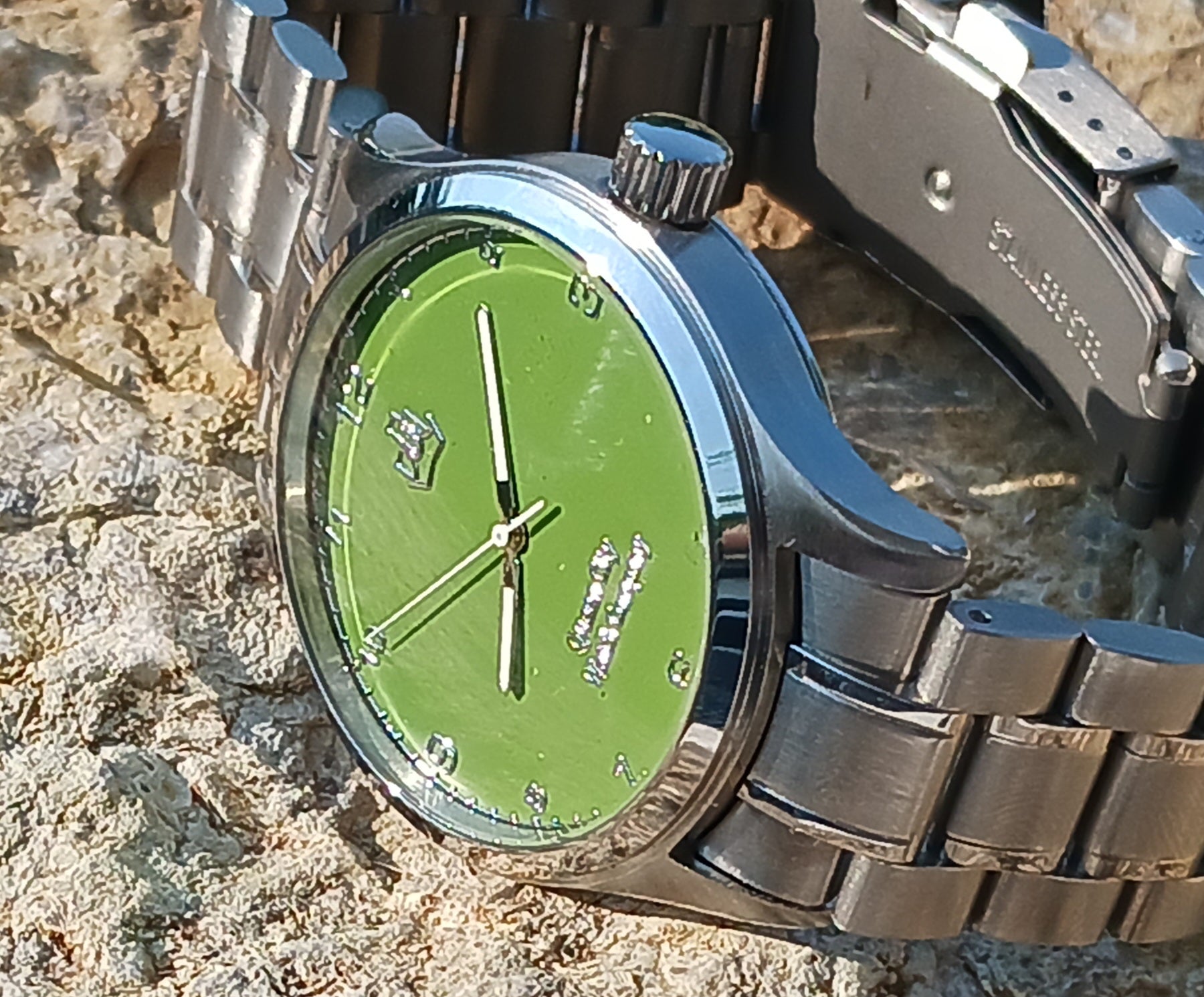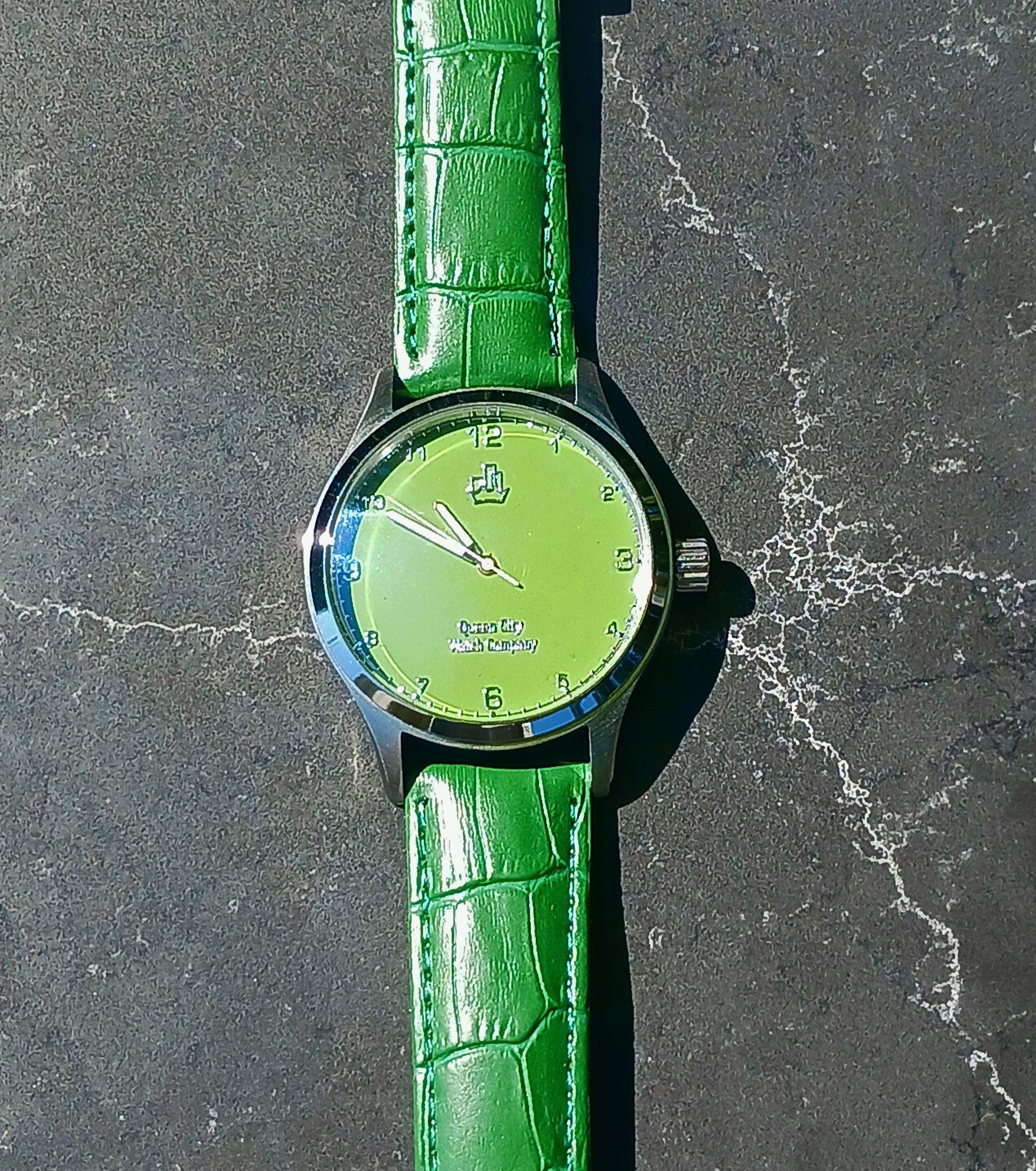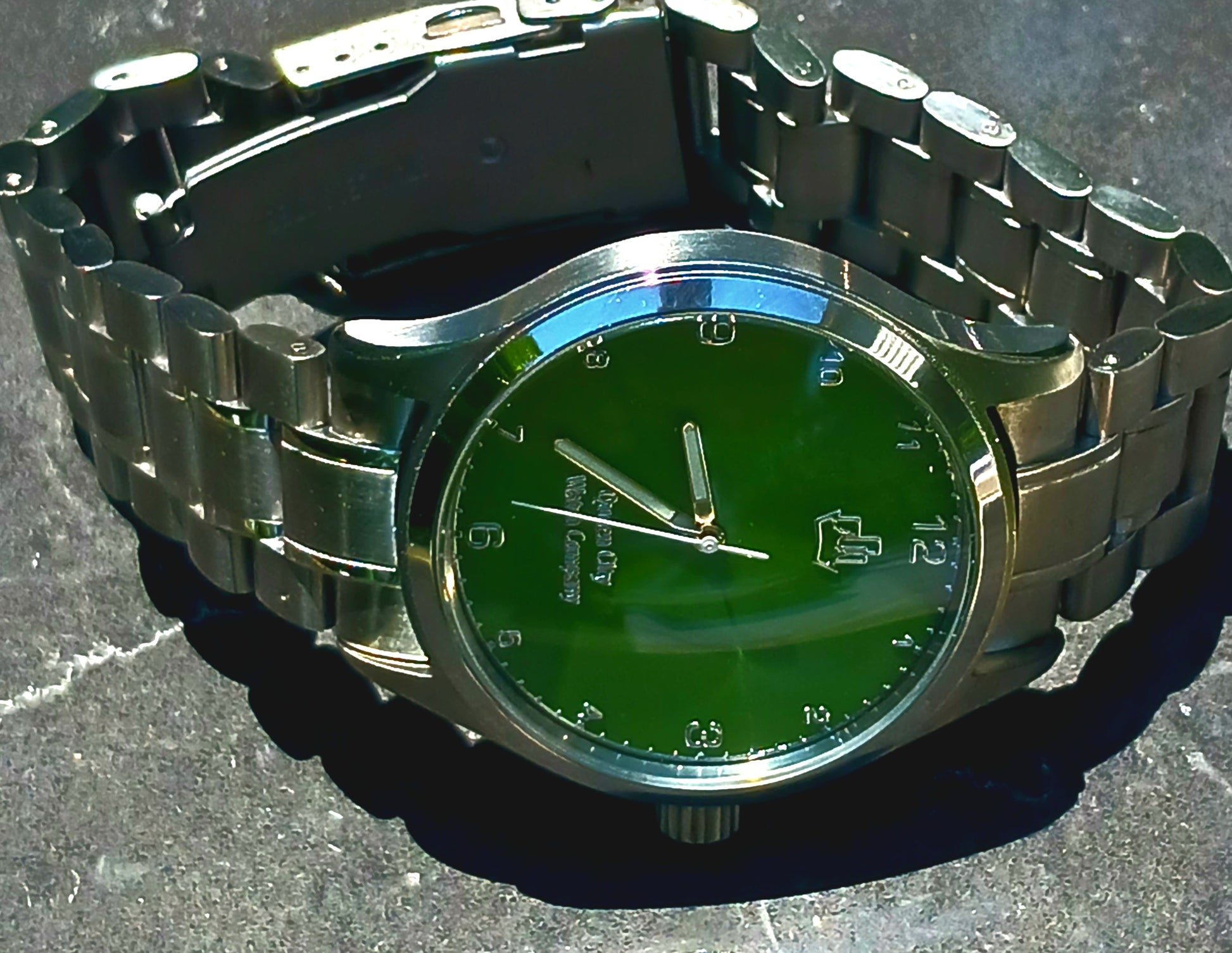 A comfortable mid-sized watch with classic style. Designed for everyday wear but versatile enough to pair with a dressy outfit. Green dial with green leather or steel band. Made with a 40mm steel case, a scratch-resistant sapphire crystal, a Ronda quartz movement, a screw down crown, and lumed hands for added visibility.