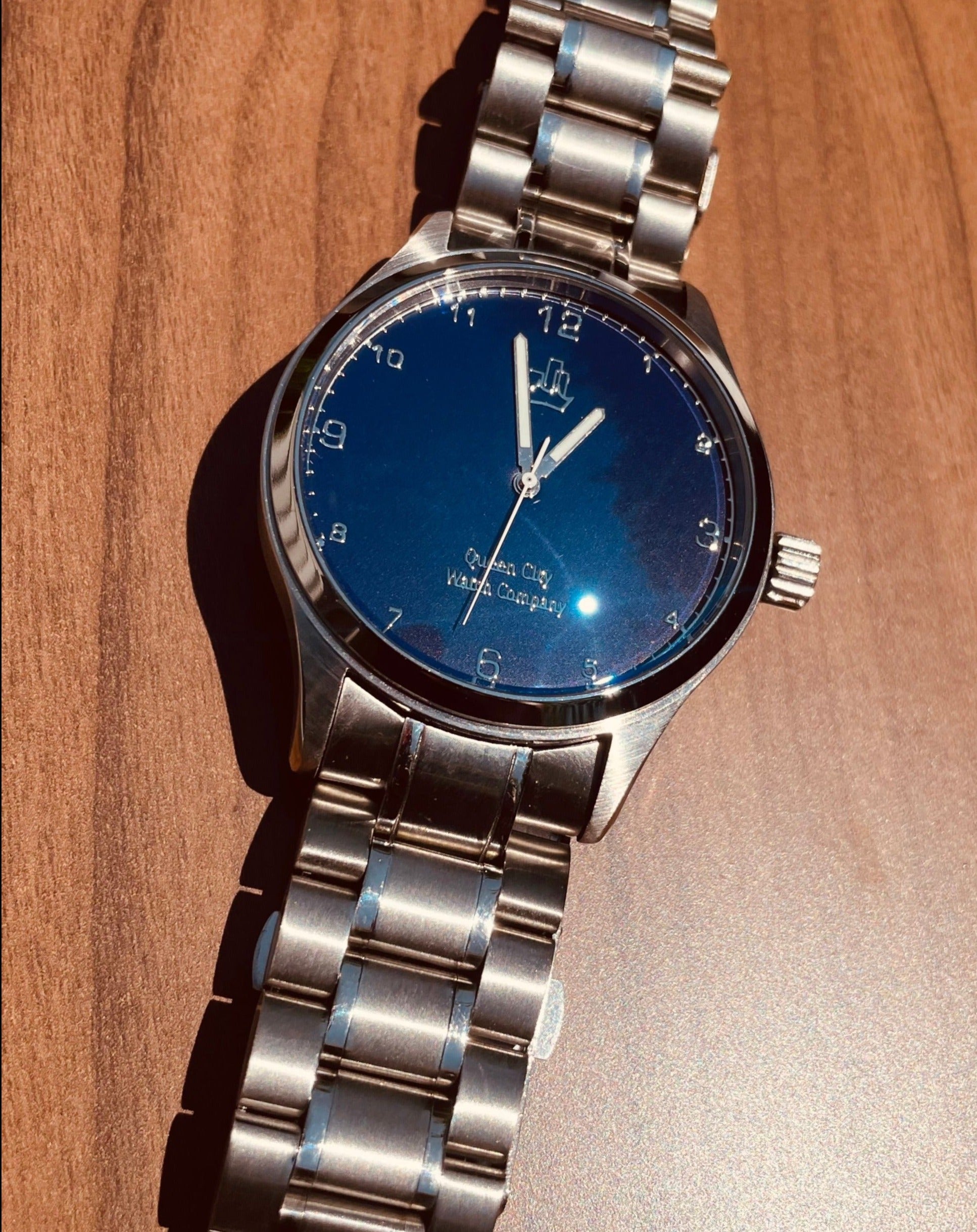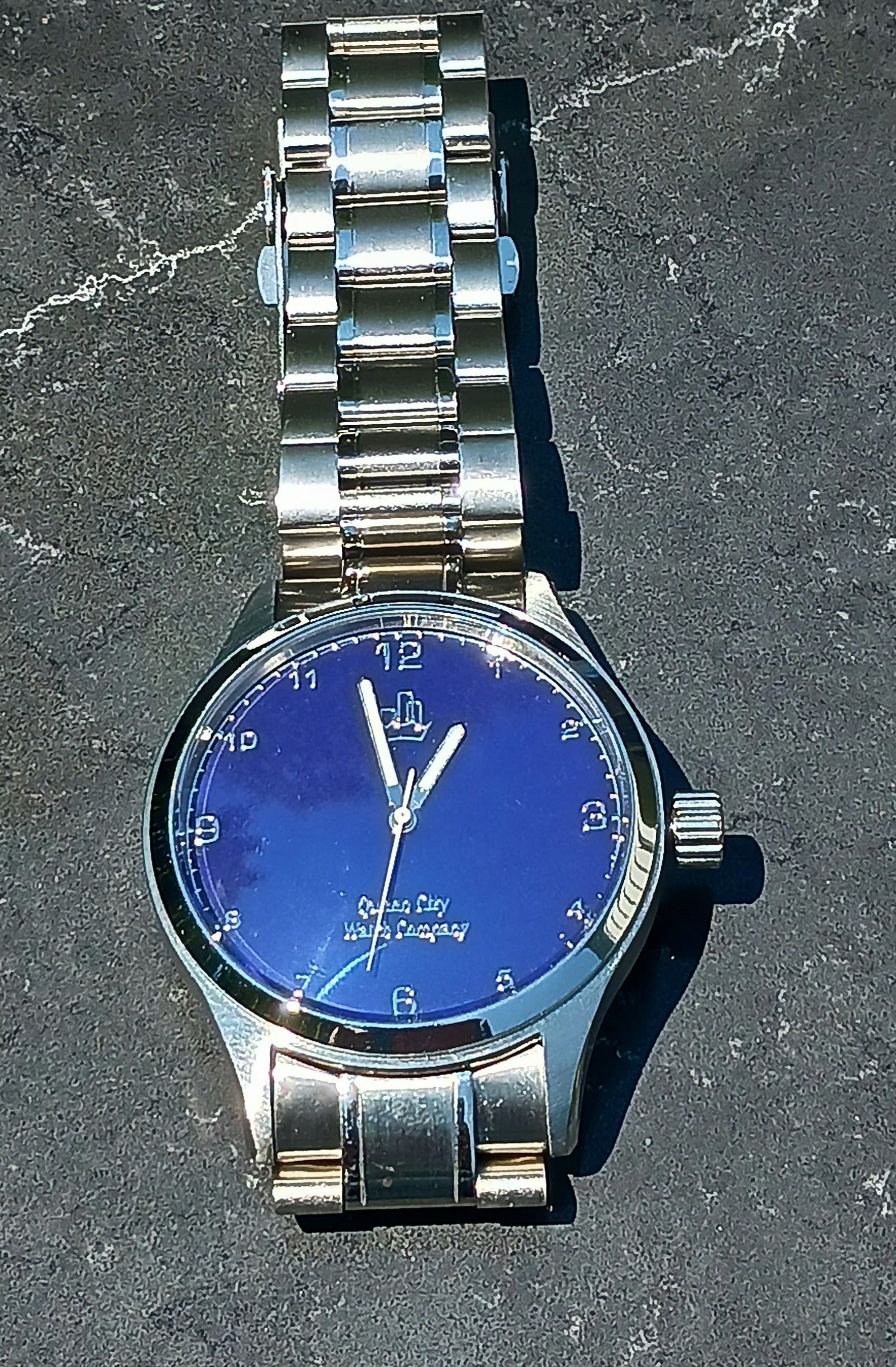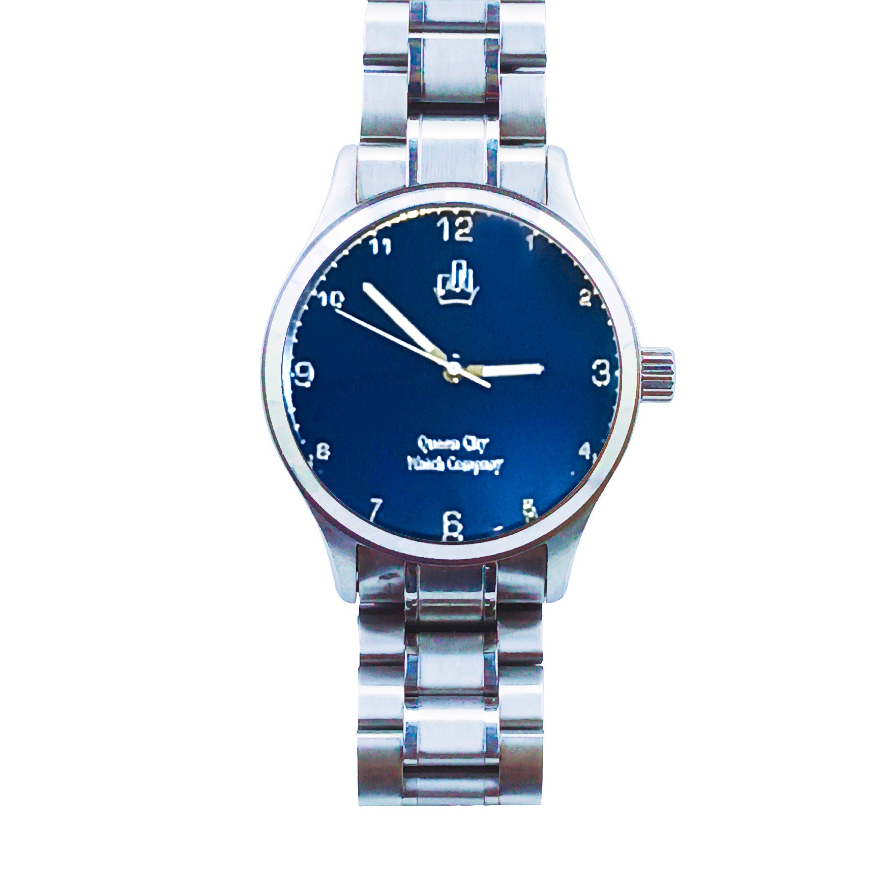 A comfortable mid-sized watch with classic style. Designed for everyday wear but versatile enough to pair with a dressy outfit. Navy dial with steel band. Made with a 40mm steel case, a scratch-resistant sapphire crystal, a Ronda quartz movement, a screw down crown, and lumed hands for added visibility.